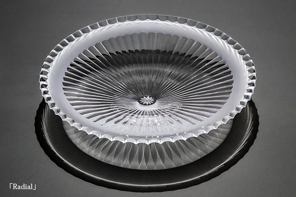 鮮やかな金赤色被せクリスタルガラスに、江戸切子の伝統文様である「菊つなぎ」と「笹っ葉」を施した飾り皿。金赤色被せクリスタルガラスと、ガラスを削ることで生まれる透明が、おめでたい紅白を表しています。