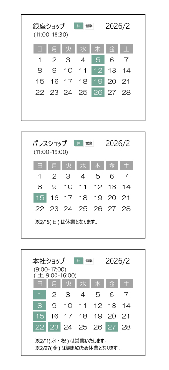 ※本社ショップは2/11(水・祝)営業、2/27は棚卸のため休業となります。
