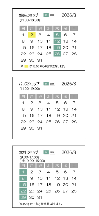※銀座ショップは3/2(月)は棚卸のため営業時間が13:00~18:30となります。