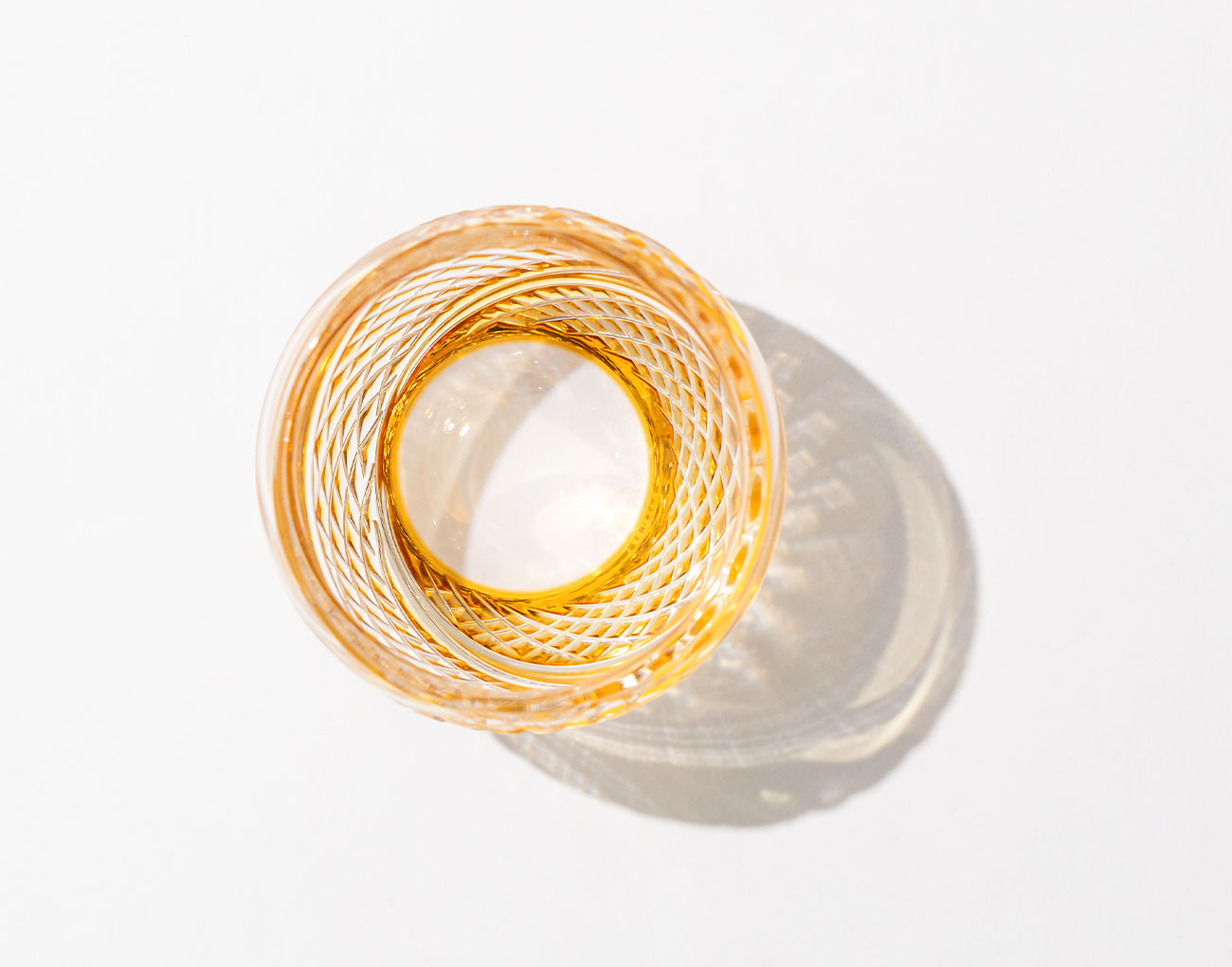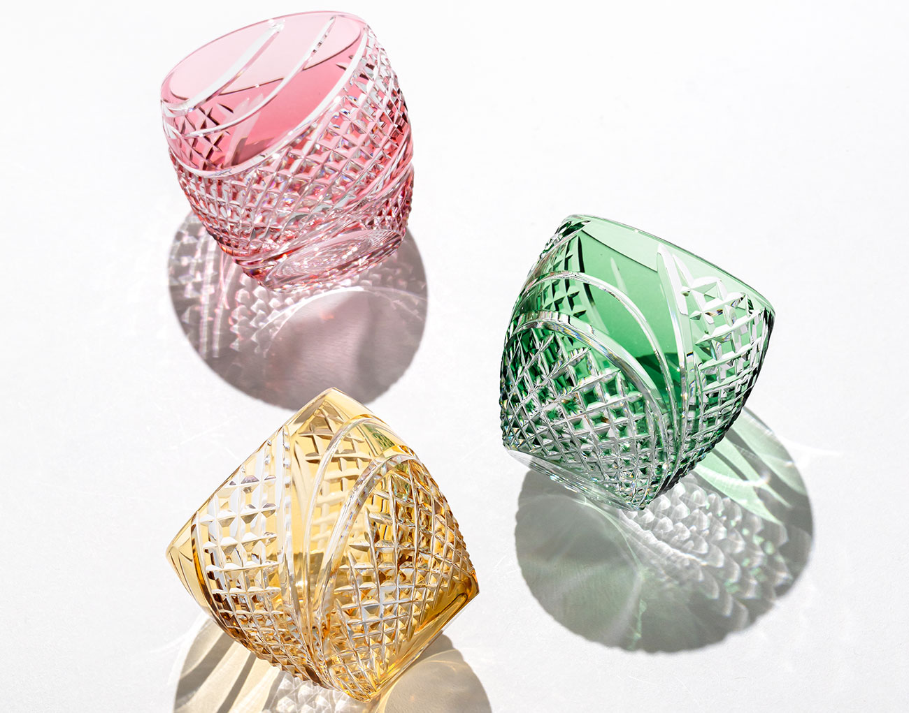 色被せクリスタルガラスに、江戸切子伝統文様の「魚子流し(ななこながし)」を施した冷酒杯。黄色の新色が追加されました。波のうねりのように施された魚子紋は、泳ぐ魚のように自由で生き生きとした美しさがあります。