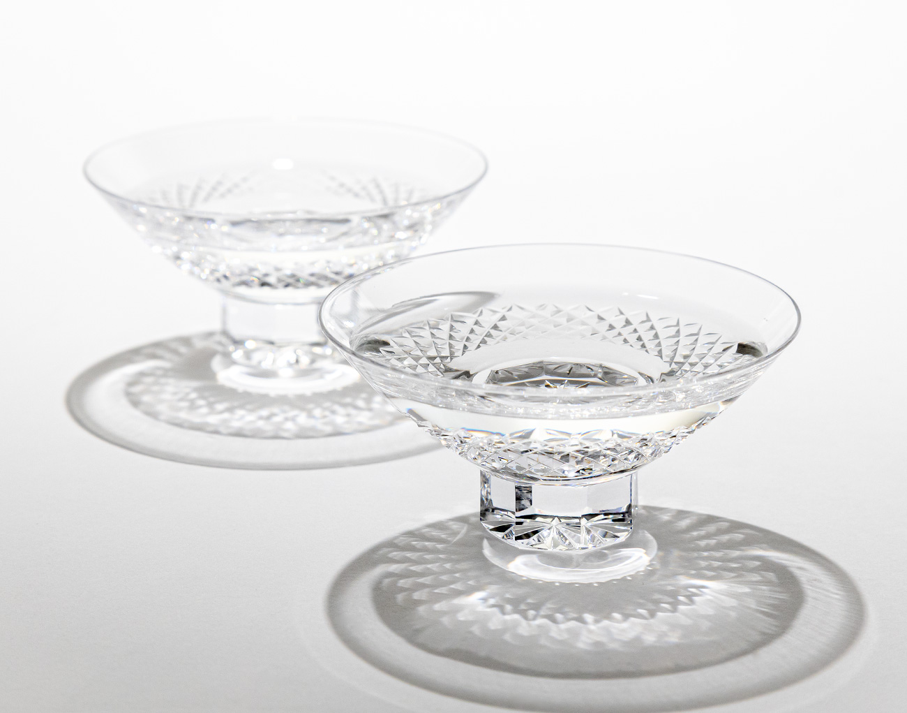 日本酒を楽しむ平盃。古くから日本で親しまれてきた平盃の形状をそのままに、シンプルでありながら細部までこだわり抜いた江戸切子文様を施しています。
